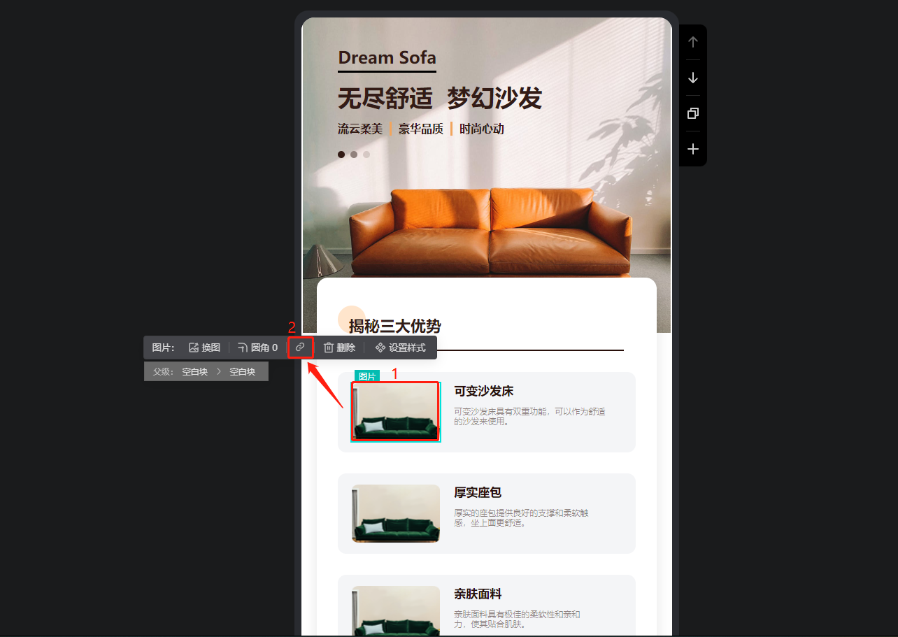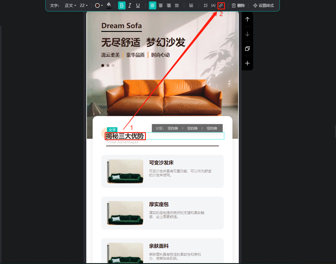 (1)選中微頁(yè)上的文字或者圖片,點(diǎn)擊【🔗】。