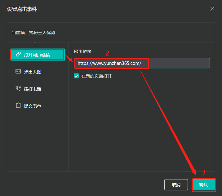 (2)選擇【打開網(wǎng)頁(yè)鏈接】,右側(cè)輸入網(wǎng)頁(yè)鏈接,點(diǎn)擊【確認(rèn)】。