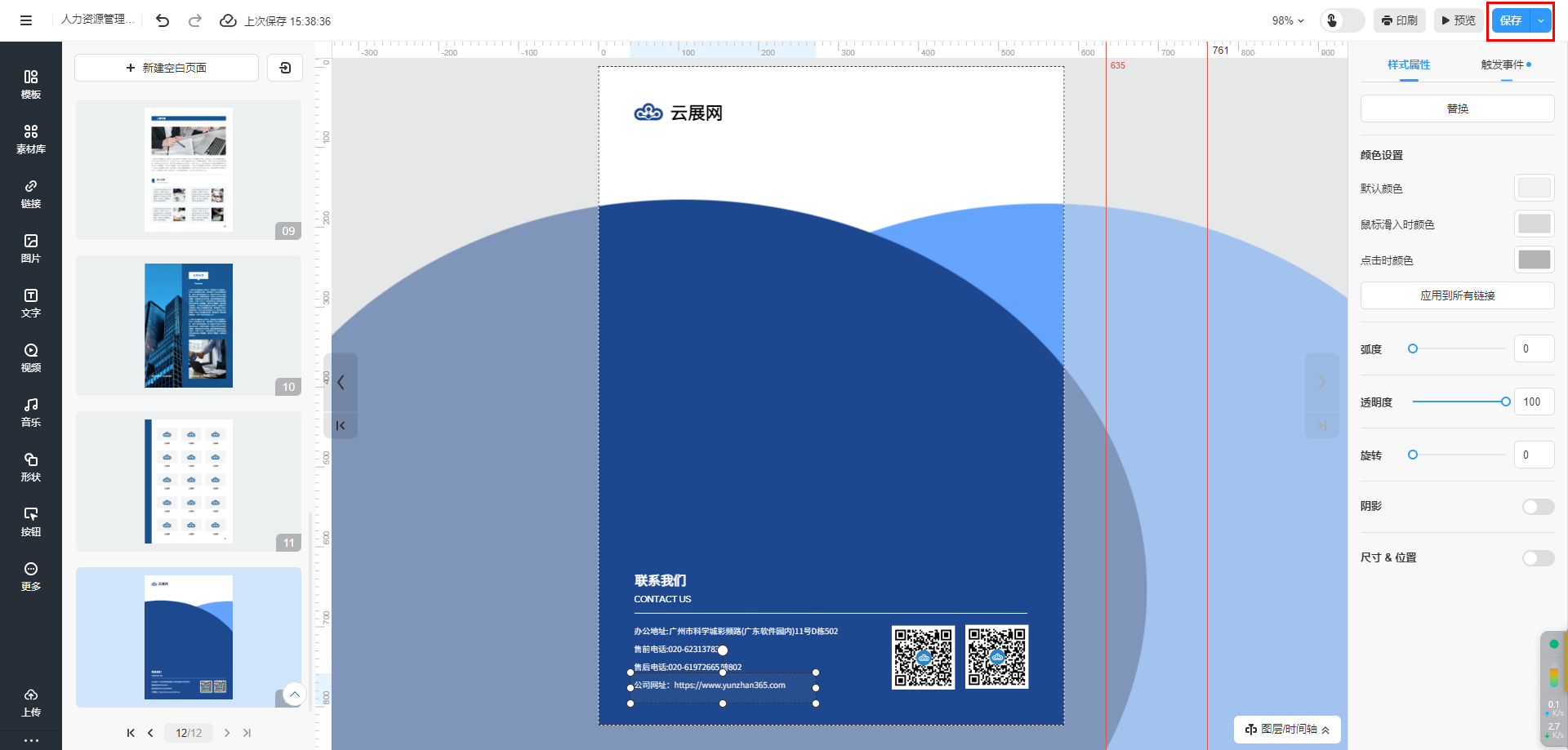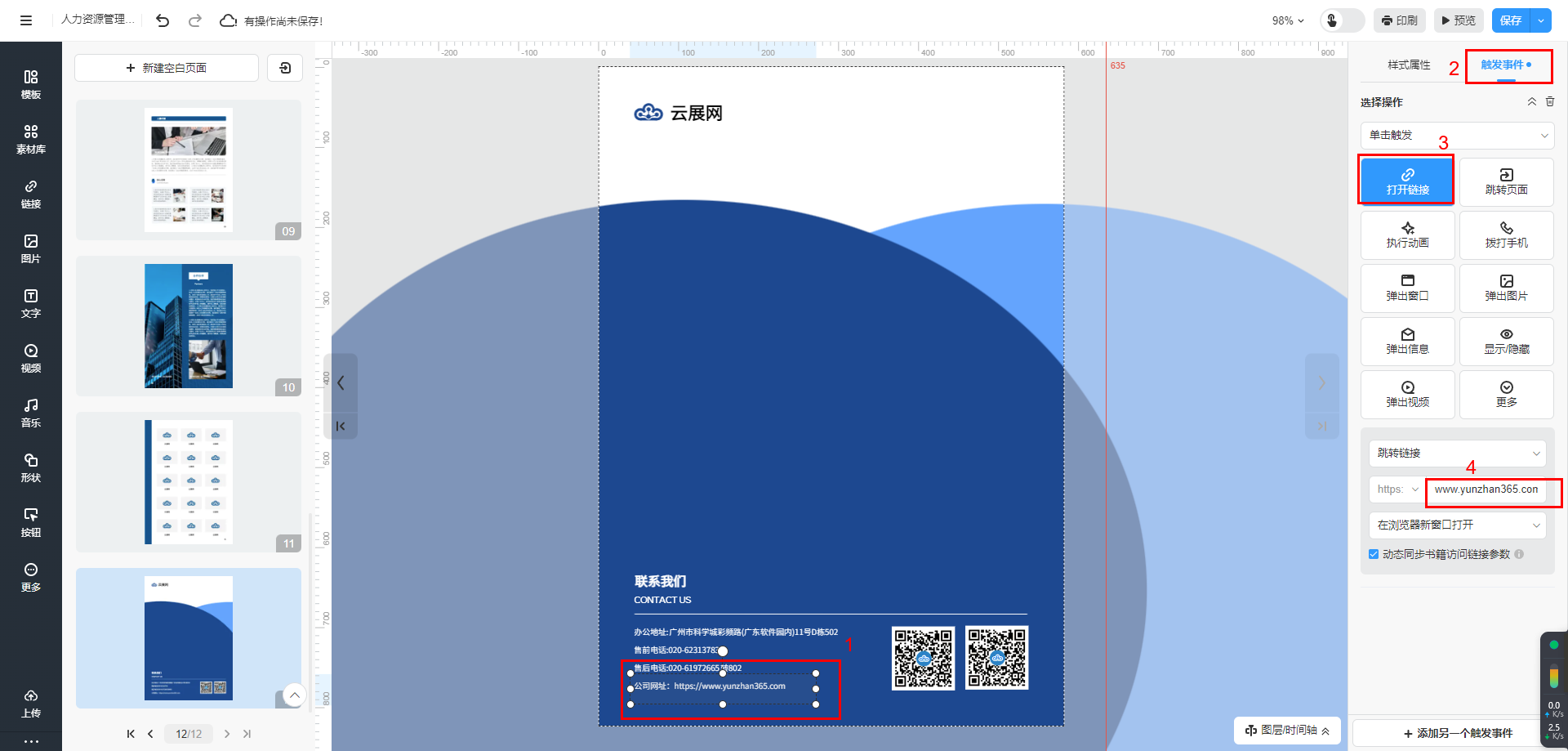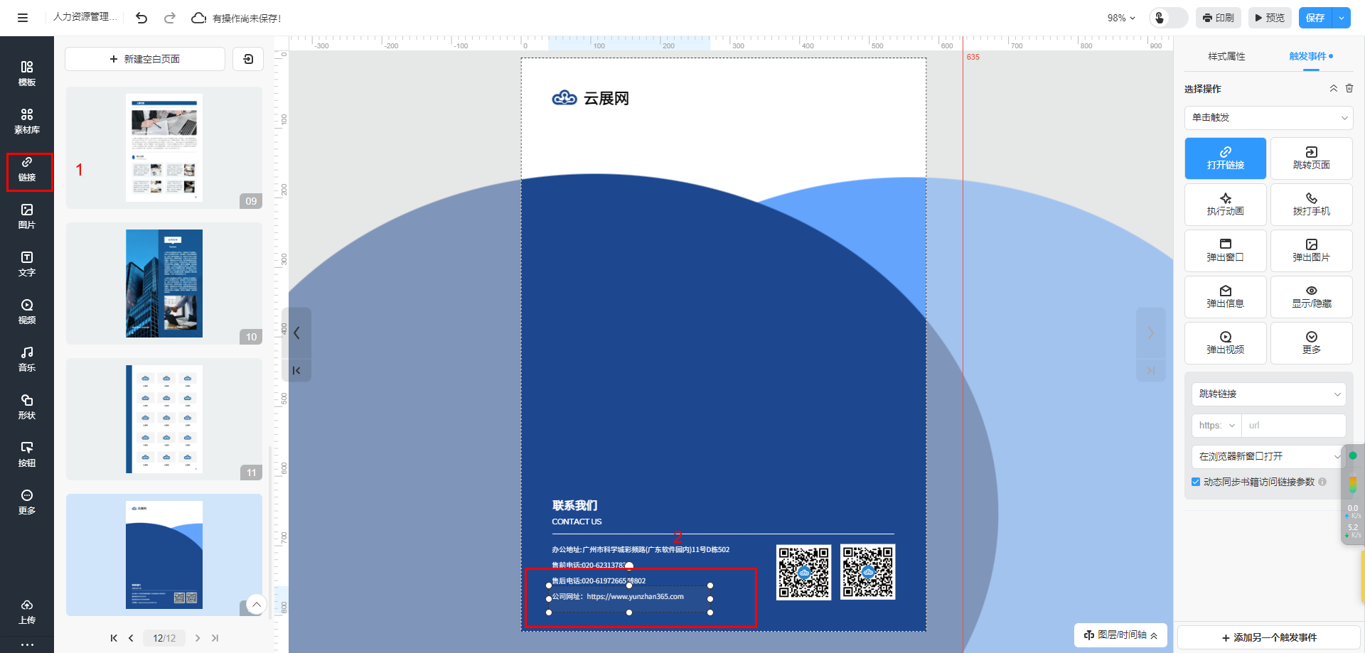 (2)在右邊設置面板,點擊【觸發(fā)事件】,選擇【打開鏈接】動作并且輸入跳轉鏈接。