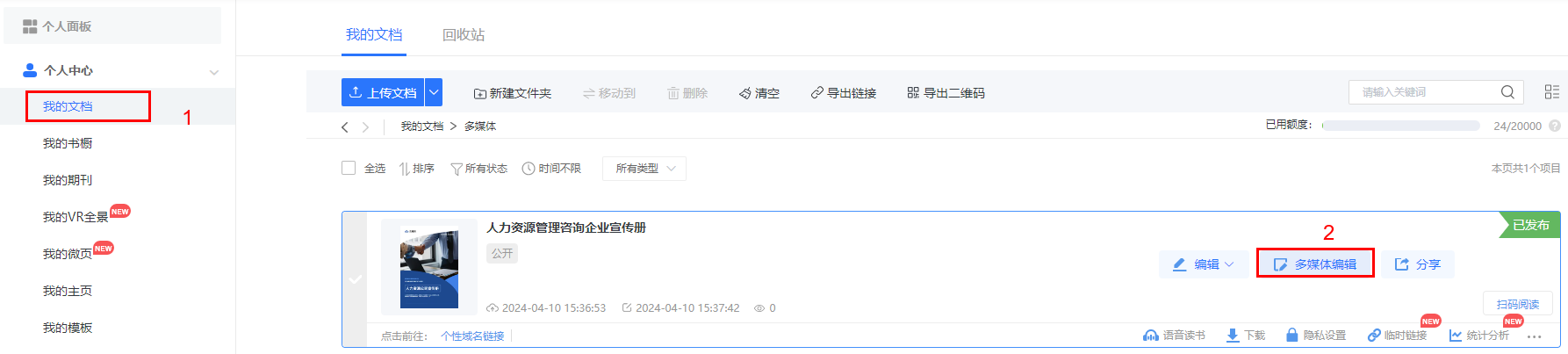 點進【我的文檔】/【文檔】,選擇對應電子書,點擊【多媒體編輯】/【內(nèi)容編輯】。