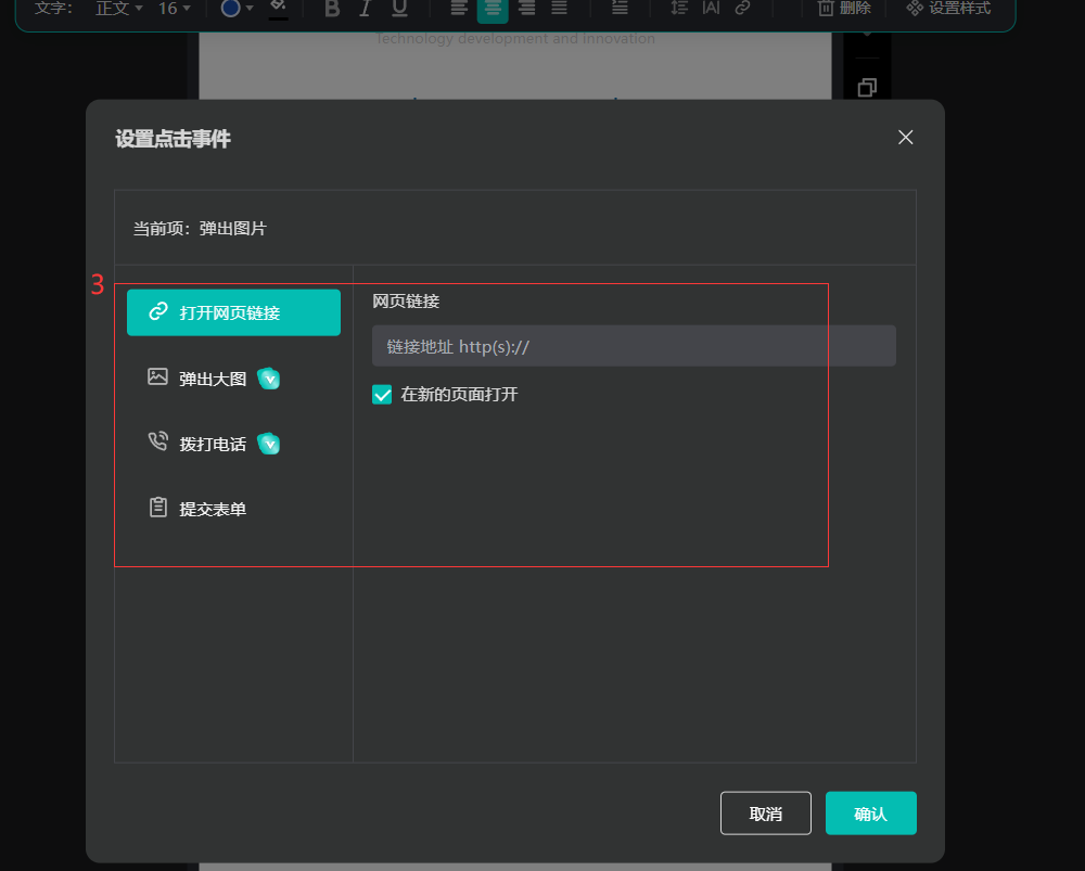 點擊“按鈕”,點擊【添加動作】,可以設(shè)置打開網(wǎng)頁鏈接/彈出大圖/撥打電話/提交表單,設(shè)置好后,點擊【確認(rèn)】