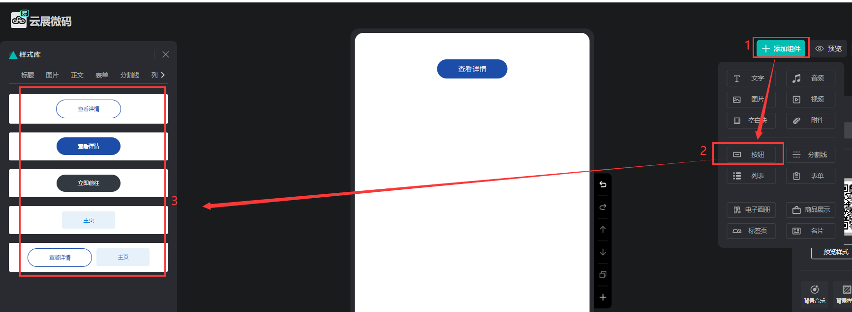 點擊【添加組件】,點擊【按鈕】,選擇左邊的“按鈕“添加到頁面上