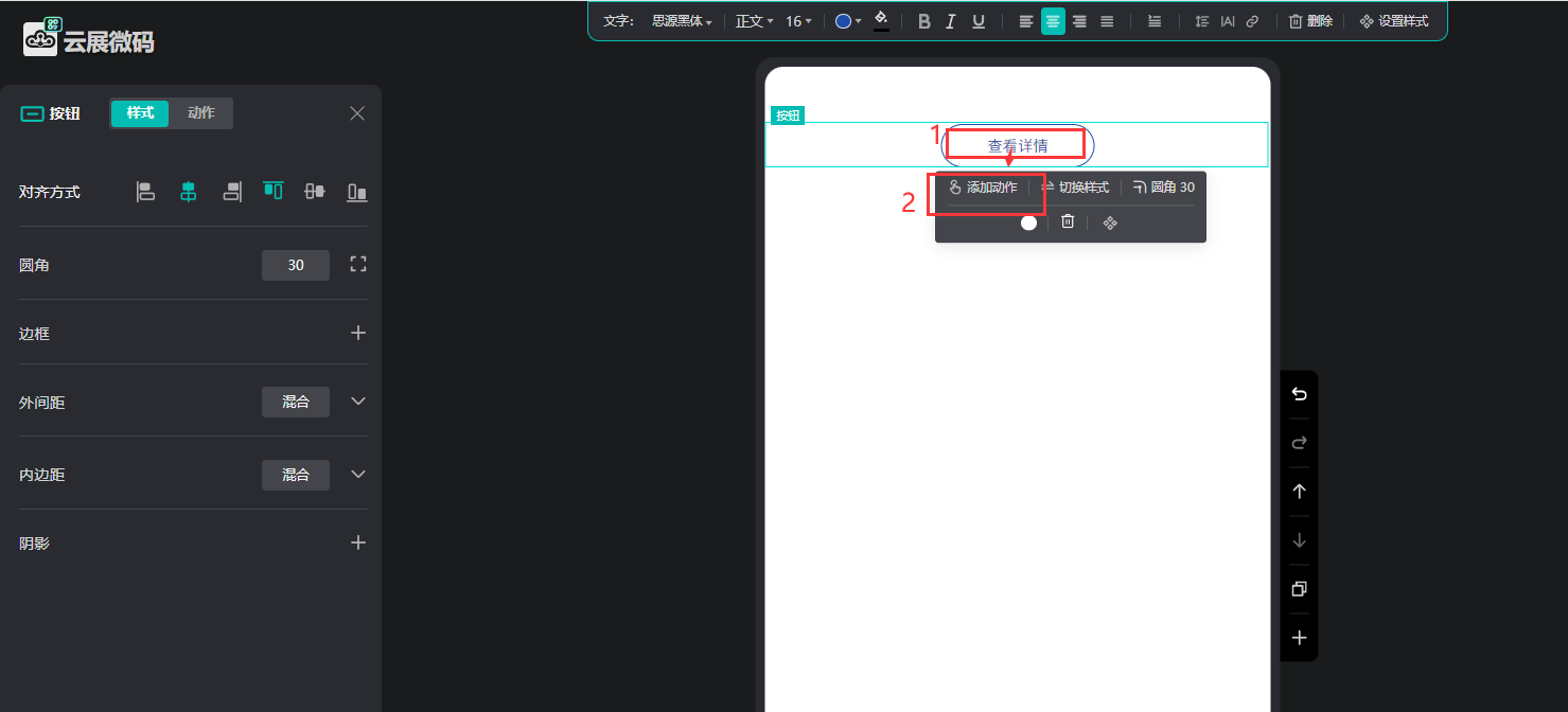 微碼頁面可以添加按鈕,可根據(jù)需要設(shè)置不同的動作屬性滿足您的使用需求,如“撥打電話、提交表單、跳轉(zhuǎn)鏈接、彈出圖片”等。