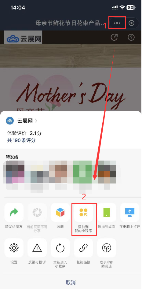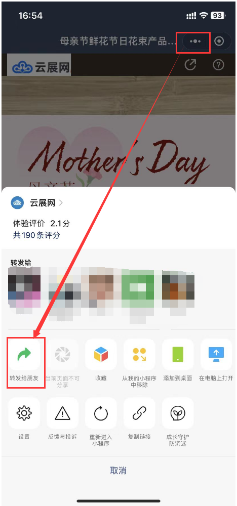 微信掃描小程序二維碼閱讀后,點擊頁面右上角的【…】按鈕,點擊【轉(zhuǎn)發(fā)給朋友】查看