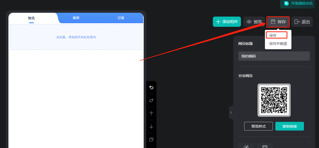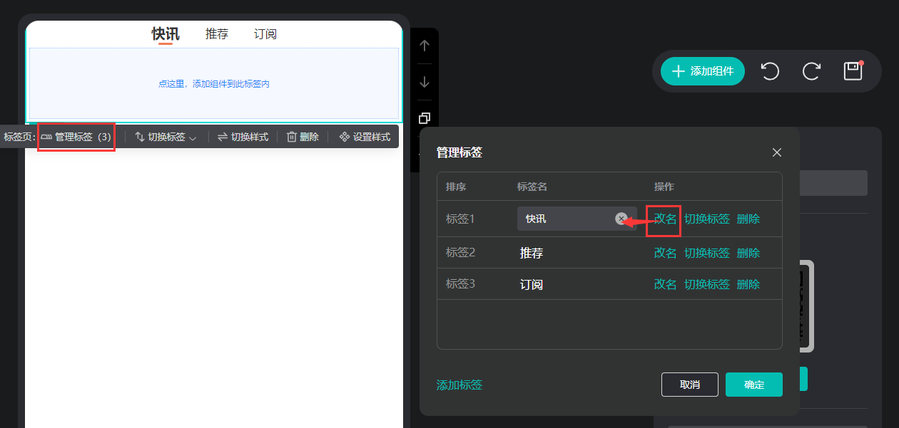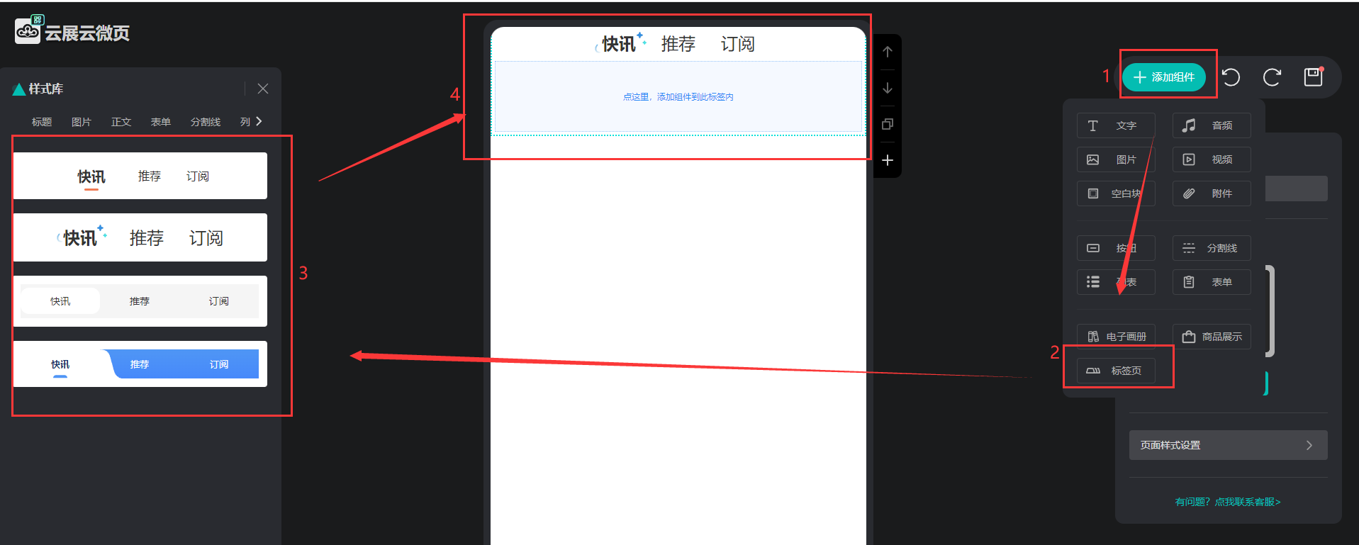 點(diǎn)擊【添加組件】,點(diǎn)擊【標(biāo)簽頁】,在左邊選擇標(biāo)簽樣式添加到微碼上。