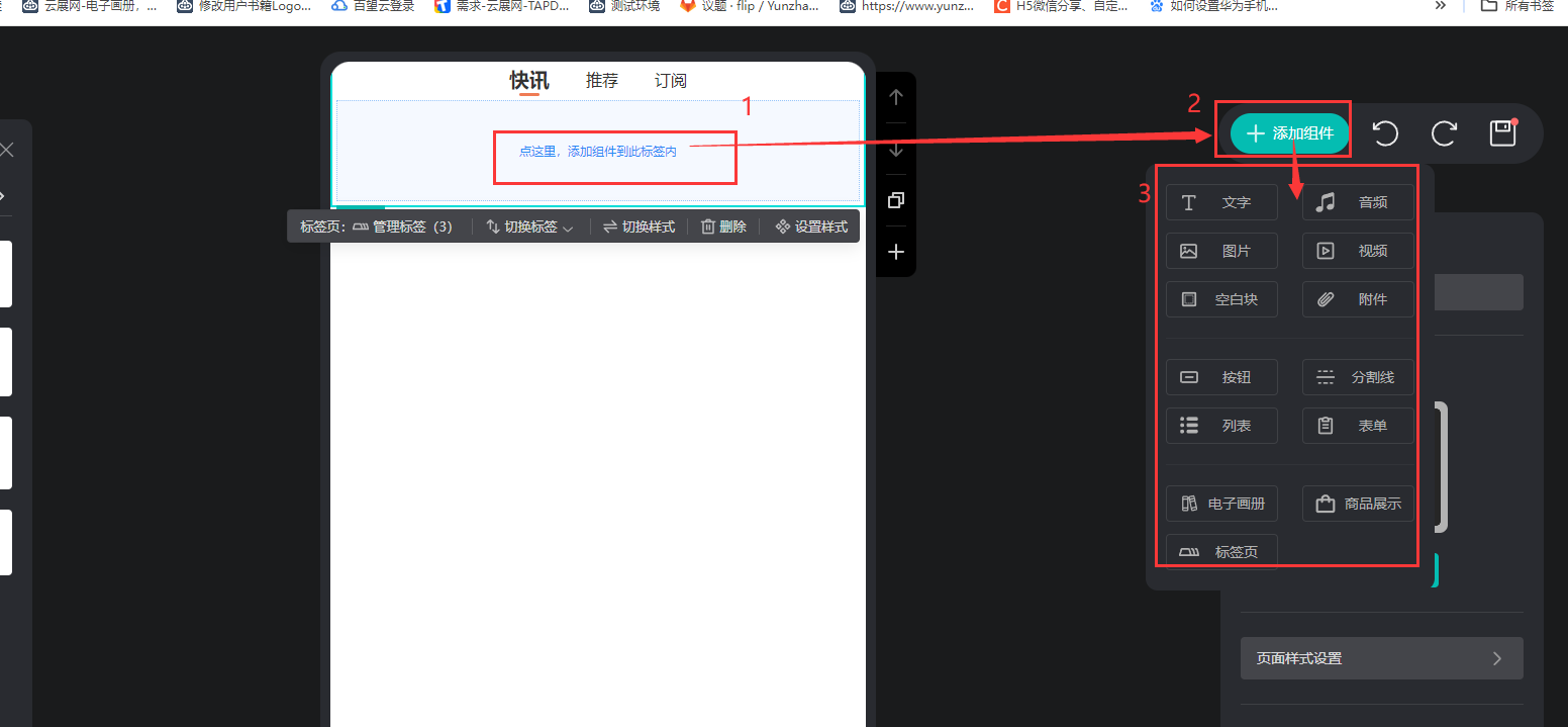 點(diǎn)擊【標(biāo)簽頁內(nèi)】,點(diǎn)擊【添加組件】,可以添加文字,圖片,音視頻,按鈕,表單等內(nèi)容在標(biāo)簽頁上。