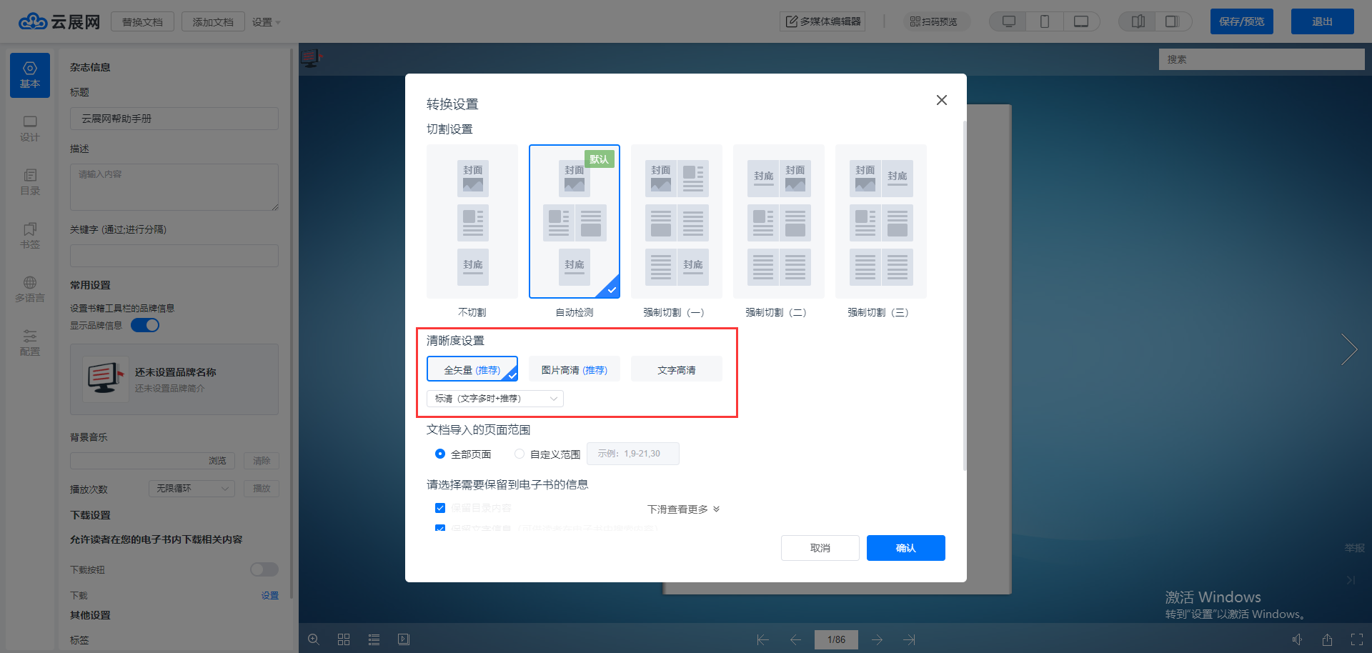 如果文檔本身清晰,但是在云展網(wǎng)上傳轉(zhuǎn)換以后模糊的話,可以設(shè)置如下三個(gè)選項(xiàng)來進(jìn)行調(diào)節(jié):