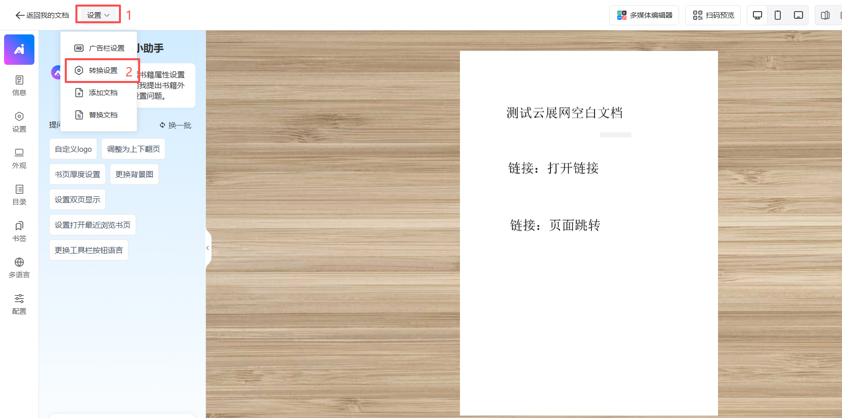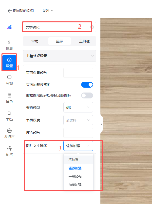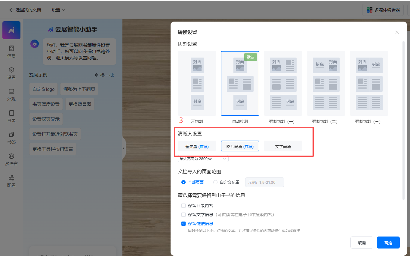 如果文檔本身清晰,但是在云展網(wǎng)上傳轉(zhuǎn)換以后模糊的話,可以設(shè)置如下三個(gè)選項(xiàng)來進(jìn)行調(diào)節(jié)。