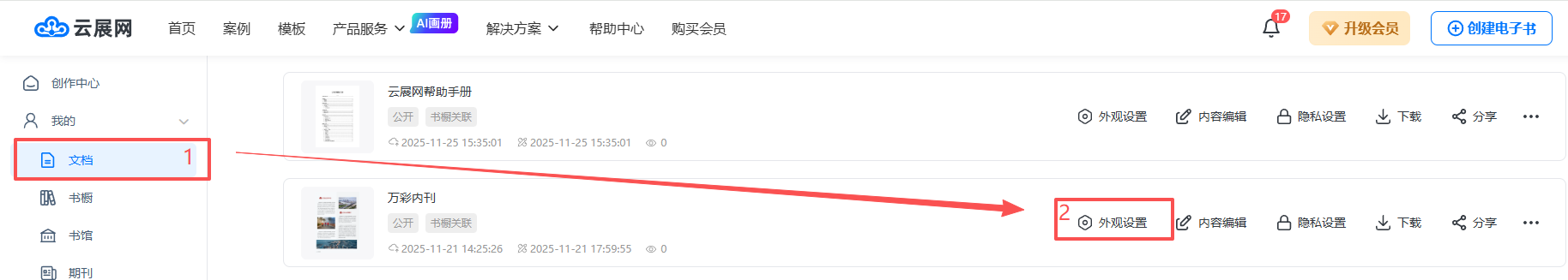 點擊【文檔】,選擇需要設(shè)置的電子書,點擊【外觀設(shè)置】。