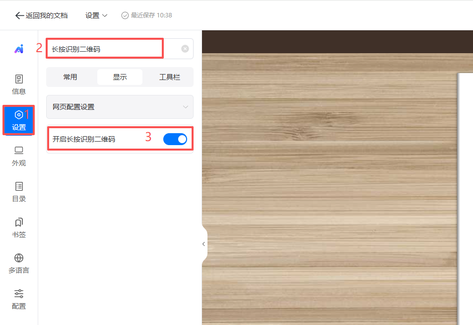點擊左邊欄的【設(shè)置】,在搜索欄輸入“長按識別二維碼”查找,勾選【開啟長按識別二維碼】后即可長按保存產(chǎn)品圖。