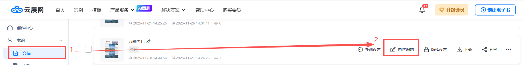 在【文檔】頁面,找到需要編輯的書,點擊【內(nèi)容編輯】。