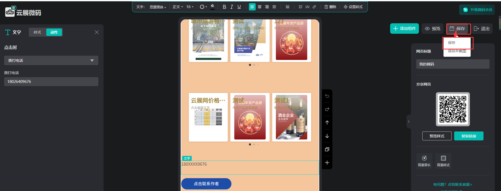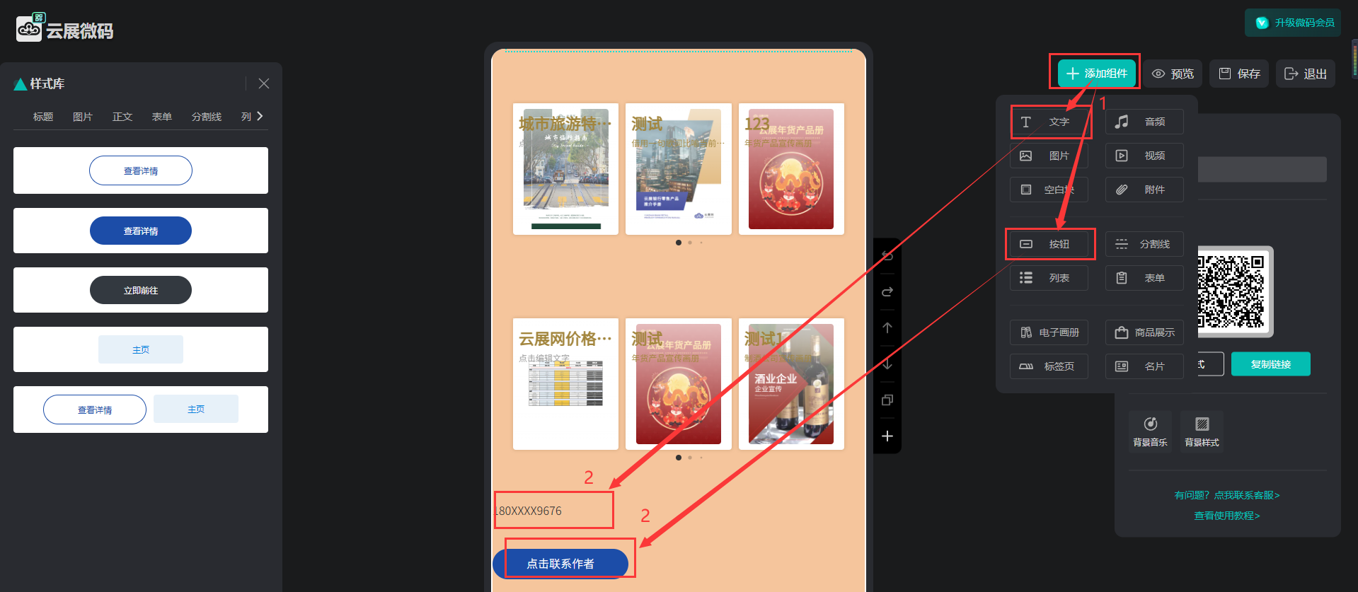 點(diǎn)擊【添加組件】,點(diǎn)擊【文字】或者【按鈕】,輸入聯(lián)系電話號碼/聯(lián)系作者