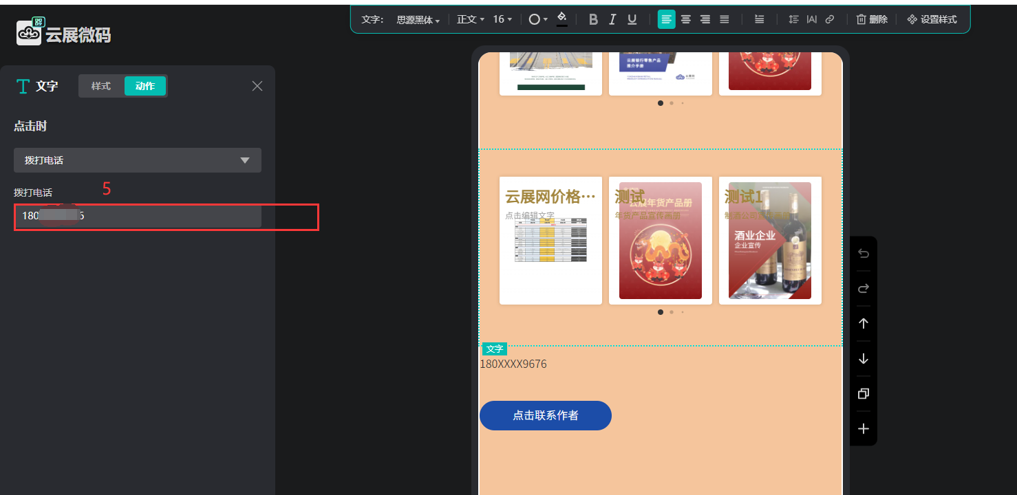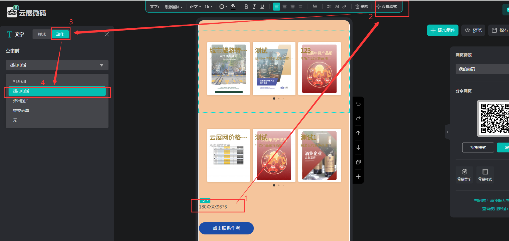 選中聯(lián)系電話號碼/按鈕,點(diǎn)擊【設(shè)置樣式】,點(diǎn)擊【動作】,設(shè)置【撥打電話】,輸入聯(lián)系電話號碼