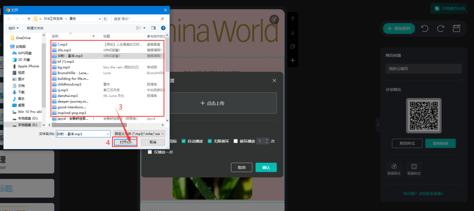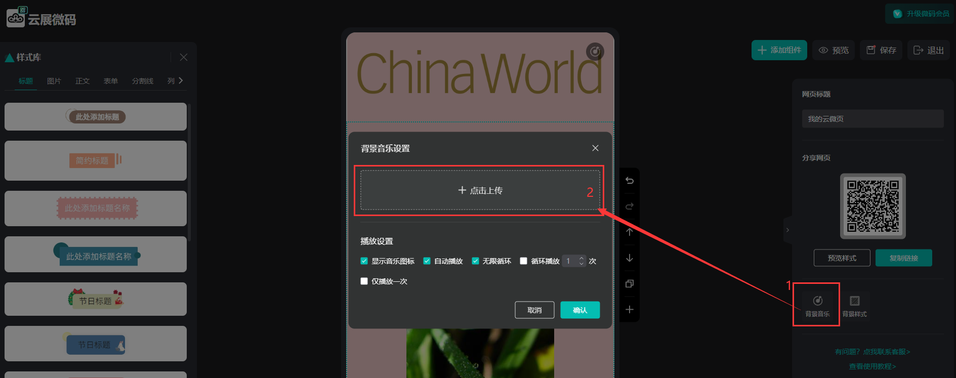 點(diǎn)擊【背景音樂】,【點(diǎn)擊上傳】,上傳MP3格式的音樂文件