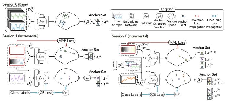 本研究在生理時間序列數(shù)據(jù)集BCI-IV 2a、NHIE、GRABMyo上對 AnchorInv 進行了評估,AnchorInv 在 所有增量會話中均取得了最佳的 Macro-F1 分?jǐn)?shù)。AnchorInv的方法框架圖如圖 1所示。