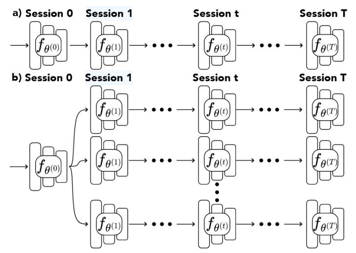 由于少樣本數(shù)據(jù)的隨機性可能導(dǎo)致性能波動,論文采用多試驗評估策略:在每個增量會話中隨機采樣M個訓(xùn)練集,分別訓(xùn)練M個模型副本。實驗設(shè)置具體如圖2所示,a)和b)分別表示現(xiàn)有文獻中的評估流程和本研究采用的評估流程。本研究最終報告這些復(fù)制實驗的均值和標(biāo)準(zhǔn)差。