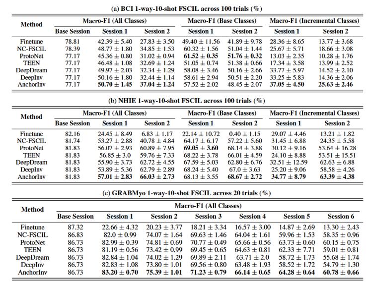 實驗分別在BCI-IV 2a運動想象EEG數(shù)據(jù)集、NHIE新生兒缺氧缺血性腦病EEG分級數(shù)據(jù)集和GRABMyo手勢識別EMG數(shù)據(jù)集上進行,皆采用1-way 10-shot設(shè)置。實驗使用EEG-Conformer作為骨干網(wǎng)絡(luò)。AnchorInv在三個數(shù)據(jù)集的所有增量階段均取得最佳Macro-F1 分?jǐn)?shù),尤其在BCI和NHIE數(shù)據(jù)集上分別比最優(yōu)基線方法提升2.19%和3.24%,具體結(jié)果參見表1: