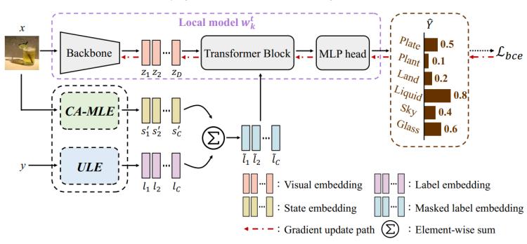 FedLGT 的整體框架如圖 1 所示,通過融合 Transformer 的全局建模能力與語言引導(dǎo)的標(biāo)簽語義對齊機(jī)制,實現(xiàn)跨客戶端知識聚合。其核心包括三大模塊:多標(biāo)簽 Transformer 基礎(chǔ)架構(gòu)、客戶端感知掩碼標(biāo)簽嵌入(CA-MLE)、通用標(biāo)簽嵌入(ULE)。