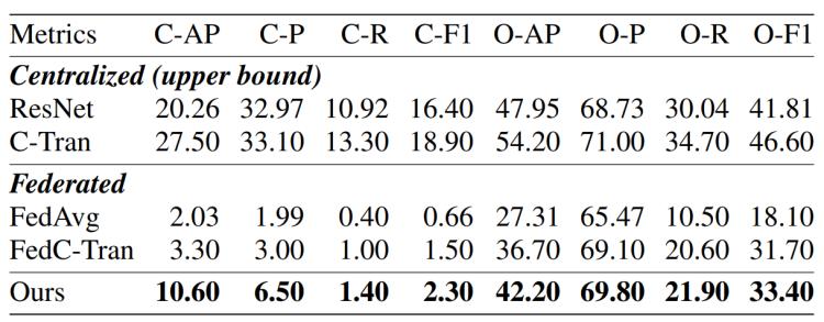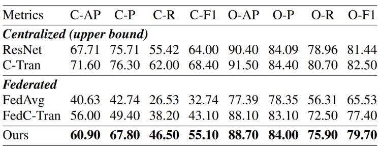 如下表1所示,在 FLAIR 粗粒度任務(wù)中,F(xiàn)edLGT 的性能全面領(lǐng)先現(xiàn)有方法:其 C-AP 達(dá)到 60.90,較 FedC-Tran(56.00)提升 4.9 個百分點,C-F1 為 55.10,較 FedC-Tran(43.10)提升 12 個百分點;與 FedAvg 相比,優(yōu)勢更為顯著,C-AP 提升近 20 個百分點。即使與集中式模型相比,F(xiàn)edLGT 的性能衰減幅度也最小,例如 C-AP 僅比集中式 C-Tran 低 10.7%,而 FedC-Tran 則低 15.6%,充分證明其對標(biāo)簽關(guān)聯(lián)的建模能力更優(yōu)。