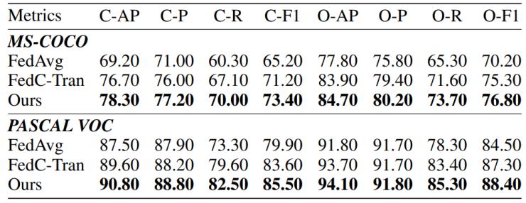 實驗結(jié)果表明,F(xiàn)edLGT在FLAIR、MS-COCO、PASCAL VOC等多標(biāo)簽數(shù)據(jù)集上全面超越現(xiàn)有聯(lián)邦學(xué)習(xí)方法(如 FedAvg、FedC-Tran),在復(fù)雜數(shù)據(jù)異質(zhì)性場景下仍能保持優(yōu)異的泛化性能,為聯(lián)邦多標(biāo)簽分類任務(wù)提供了全新解決方案。