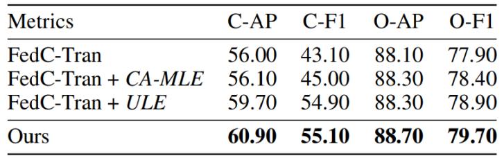 如下表4所示,消融實驗進(jìn)一步驗證了各核心組件的有效性:僅添加 ULE 時,F(xiàn)edC-Tran 的 C-AP 從 56.00 提升至 59.70(+3.7 個百分點),證明統(tǒng)一標(biāo)簽語義空間的重要性;僅添加 CA-MLE 時,C-AP 僅提升 0.1 個百分點,但與 ULE 結(jié)合后,C-AP 可進(jìn)一步提升至 60.90(+1.2 個百分點),體現(xiàn)了組件間的協(xié)同價值。