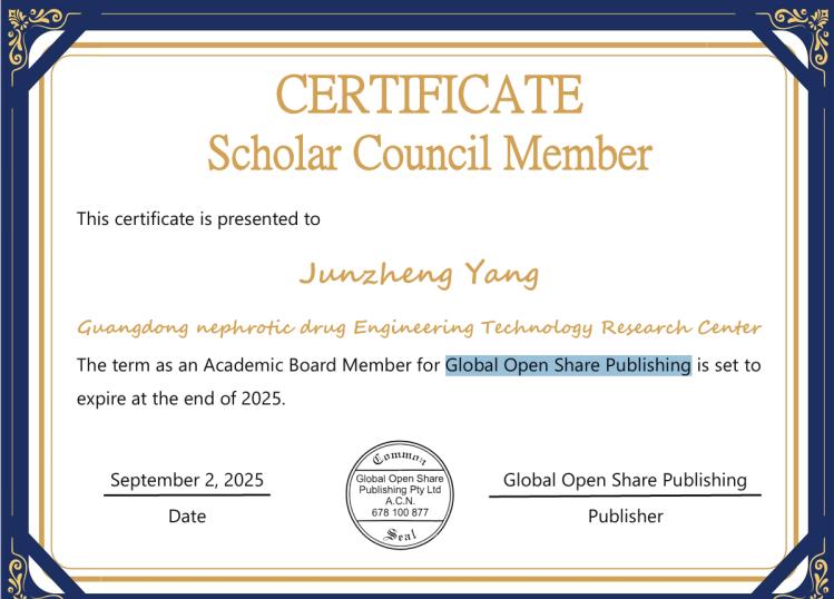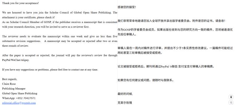 近日,收到Global Open Share Publishing出版社發(fā)來(lái)的郵件,說(shuō)基于當(dāng)前學(xué)術(shù)水平和影響力,想聘為學(xué)術(shù)委員會(huì)委員,倍感榮幸。Global Open Share Publishing (GOSP) 是一個(gè)全球開(kāi)放獲取的出版平臺(tái),旨在連接來(lái)自不同學(xué)科的研究人員、學(xué)者和從業(yè)者。其目標(biāo)是促進(jìn)開(kāi)創(chuàng)性研究和前沿發(fā)現(xiàn)的傳播,從而推動(dòng)科學(xué)和社會(huì)的進(jìn)步。GOSP 通過(guò)提供開(kāi)放獲取的出版物,增加研究的可見(jiàn)性和可獲取性,促進(jìn)科學(xué)發(fā)現(xiàn)和創(chuàng)新。此外,GOSP 還致力于出版高質(zhì)量的學(xué)術(shù)期刊,促進(jìn)知識(shí)交流和跨學(xué)科合作。 以下為相關(guān)郵件內(nèi)容和證書(shū):