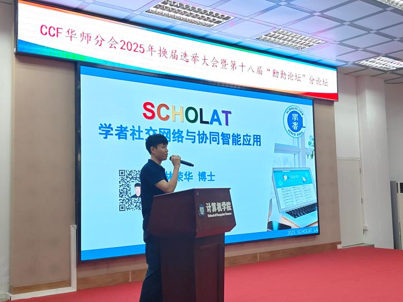 2025年10月13日下午,林榮華副研究員應邀參加了第五屆CCF華師學生分會換屆選舉大會暨第十八屆”勷勤論壇”分論壇,并做了《學者社交網(wǎng)絡(luò)與協(xié)同智能應用》特邀報告,分享SCHOLAT團隊最新研究成果。
